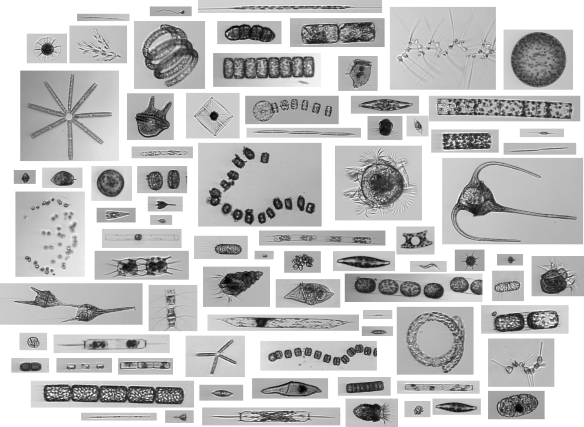 WHOI scientists are working to show off the diversity of phytoplankton by opening access to images being produced by Imaging FlowCytobot, or IFCB for short. IFCB is an automated underwater microscope designed by Rob Olson and Heidi Sosik. They build IFCBs from lasers, video cameras, microscope parts, and small computers. IFCB can take more than 10 pictures per second as phytoplankton and other small particles are speeding by the video camera in a thin stream of seawater.